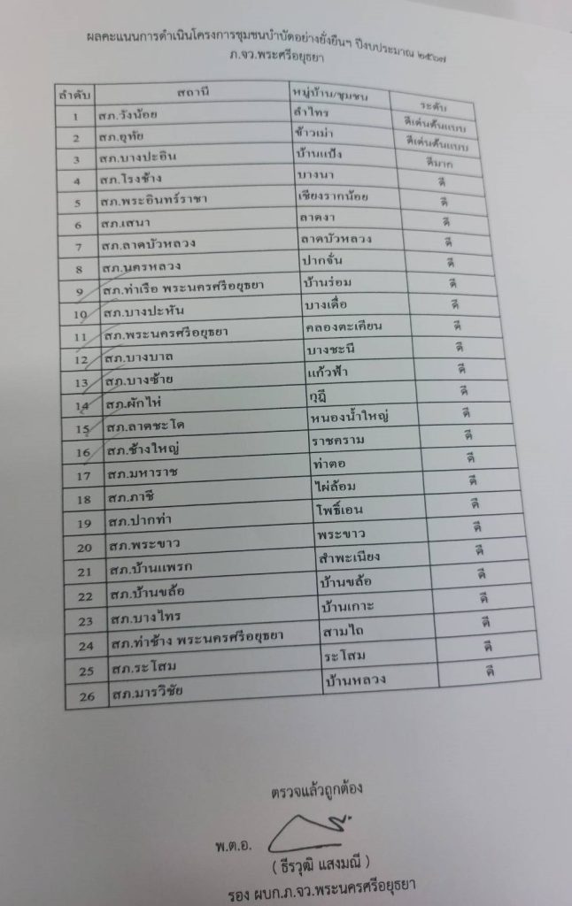 การประเมินโครงการชุมชนยั่งยืน ในพื้นที่แพร่ระบาดของยาเสพติด ตามนโยบายเร่งด่วนของรัฐบาล สภ.โรงช้าง อันดับที่ ๔ จาก ๒๖ สภ.ฯของ ภ.จว.พระนครศรีอยุธยา ซึ่ง ดำเนินการในพื้นที่ชุมชนวัดใต้ ม.๔ ต.บางนา อ.มหาราช ฯ