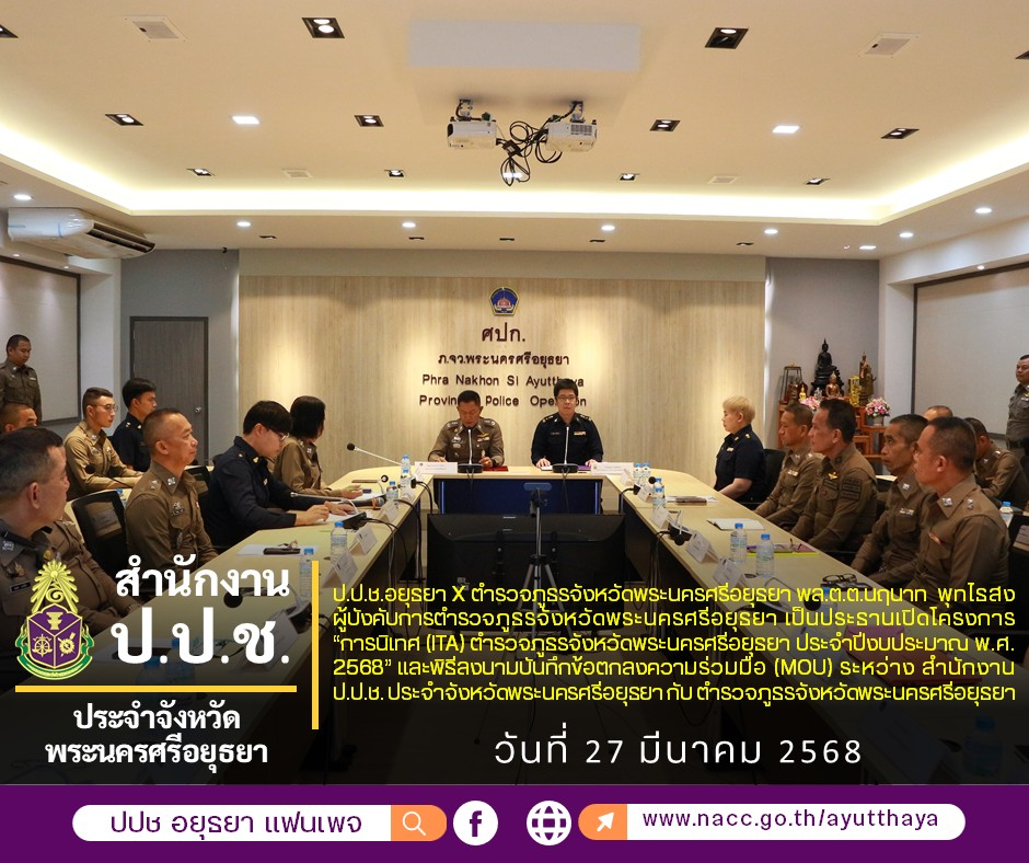 วันที่ 27 มีนาคม 2568 พล.ต.ต.นฤนาท พุทไธสง ผู้บังคับการตำรวจภูธรจังหวัดพระนครศรีอยุธยา เป็นประธานเปิดโครงการ “การนิเทศ (ITA) ตำรวจภูธรจังหวัดพระนครศรีอยุธยา ประจำปีงบประมาณ พ.ศ. 2568” และพิธีลงนามบันทึกข้อตกลงความร่วมมือ (MOU) ระหว่าง สำนักงาน ป.ป.ช. ประจำจังหวัดพระนครศรีอยุธยา กับ ตำรวจภูธรจังหวัดพระนครศรีอยุธยา ณ ห้องประชุม สถานีตำรวจภูธรจังหวัดพระนครศรีอยุธยา ลังเสร็จสิ้นพิธีลงนามบันทึกข้อตกลงความร่วมมือ (MOU) จะเป็นการนิเทศ (ITA) ตำรวจภูธรจังหวัดพระนครศรีอยุธยา โดยวิทยากรจากกลุ่มงานป้องกันการทุจริต สำนักงาน ป.ป.ช. ประจำจังหวัดพระนครศรีอยุธยา กลุ่มเป้าหมายจะเป็นผู้แทนจากสถานีตำรวจภูธรในพื้นที่จังหวัดพระนครศรีอยุธยา