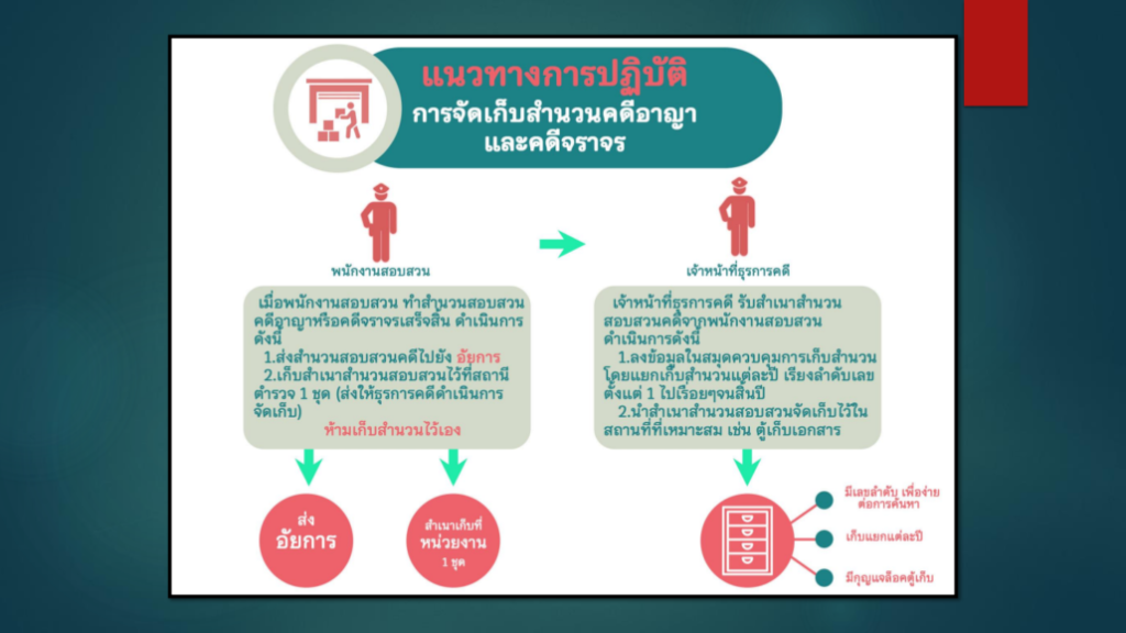 แนวทางการจัดเก็บสำนวนการสอบสวนคดีอาญาและคดีจราจรให้หัวหน้างานสอบสวนมีหน้าที่เก็บรักษาไว้ในห้องหรือตู้ที่จัดทำไว้โดยเฉพาะให้อยู่ในสภาพเรียบร้อย และระมัดระวังมิให้สูญหาย จัดการเก็บสำนวนการสอบสวนและสำเนาสำนวนการสอบสวน ให้แยกเป็นสัดส่วน ได้แก่