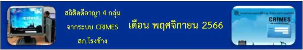คลิ๊กดูที่นี่ - ข้อมูลผลการดำเนินงานในเชิงสถิติด้านคดีอาญา 4 กลุ่มตามระบบ CRIMES เดือน พ.ย.66 ในรูปแบบไฟล์ Excel